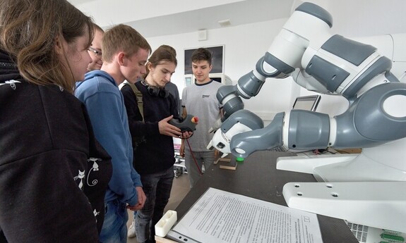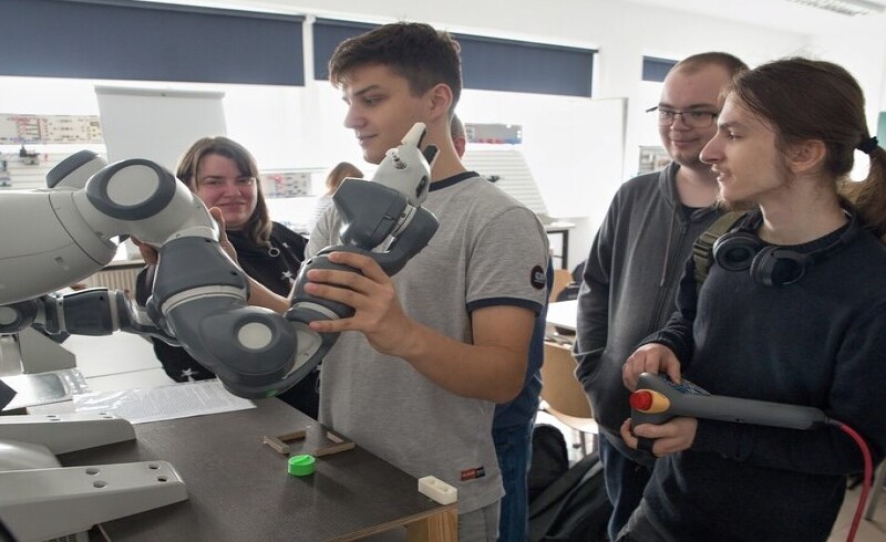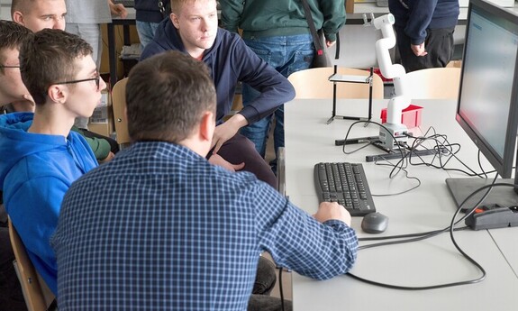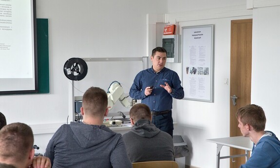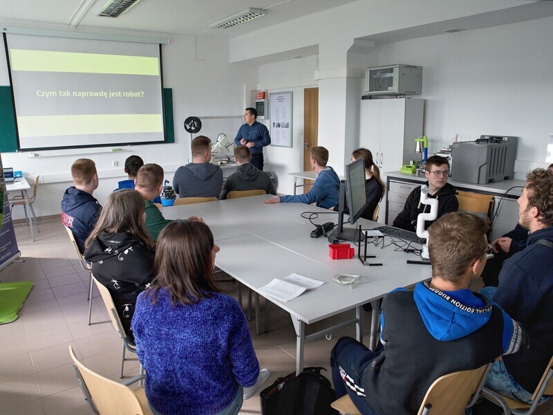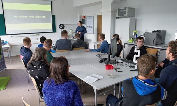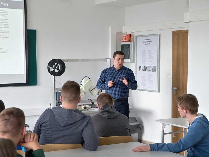 During the classes, Dr. Eng. Łukasz Sobaszek and members of the student scientific club presented the fascinating world of robotics to the students of the Special Technical Secondary School No. 2 in Lublin. The teachers and students had the opportunity to explore three robot stations, gain knowledge of how to control and program them, giving them specific tasks.